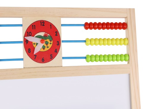 Rama wielofunkcyjnej tablicy edukacyjnej wykonana jest w całości z drewna – wszystko jest doskonale wyszlifowane i bezpieczne dla najmłodszych. Tablica posiada klasyczne liczydło z koralikami, z którym dziecko zacznie przygodę z liczeniem. Następnie może uczyć się podstawowych działań matematycznych, takich jak dodawanie, odejmowanie oraz mnożenie. Dziecko będzie miało również do czynienia z zegarem, na którym będzie mogło dowolnie ustawić czas za pomocą wskazówek; nauczy się rozpoznawania godziny.