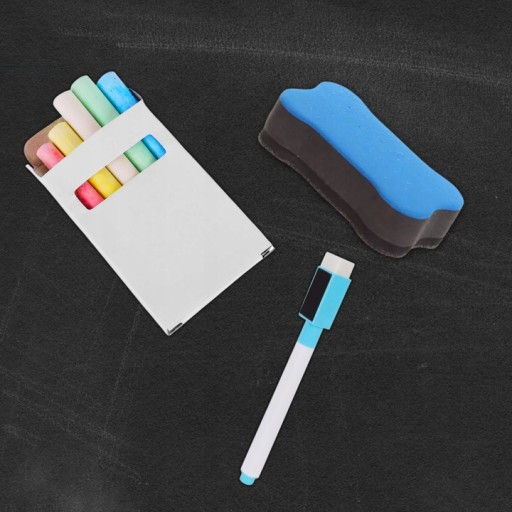 W zestawie znajdują się mazak z magnesem, gąbka z magnesem i zestaw kredy, co zapewnia kompletny pakiet do nauki i zabawy.