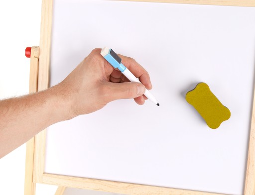 Biała strona tablicy przeznaczona jest do malowania mazakiem suchościeralnym (który również można zmazać gąbeczką na koniec zabawy).