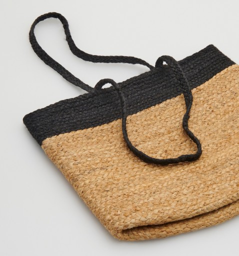 Nowy z papierowymi metkami, koszyk firmy RESERVED. Kolor słomkowy z czarnym paskiem u góry. Posiada krótsze czarne uchwyty do noszenia na ramieniu bądź w ręce. Pleciona. Wewnątrz jedna duża przegroda. Bez zamykania. Fason prosty plażowy. Wykonana ze słomkowego, plecionego materiału - juty.
