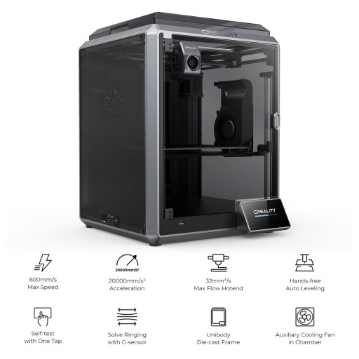 Dzięki przyspieszeniu 20 000 mm/s² Creality K1 przyspiesza do 600 mm/s w zaledwie 0,03 sekundy, co czyni ją do 12 razy szybszą niż inne drukarki FDM dostępne na rynku.