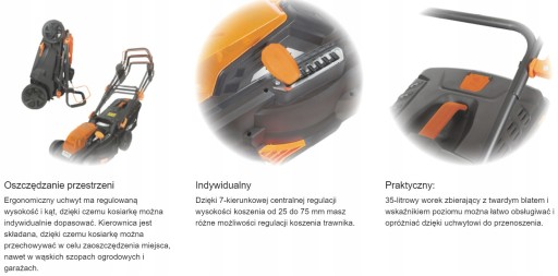 - szerokość koszenia aż 37 cm, z koszem 35 , 7 wysokości koszenia regulowanych centralnie,