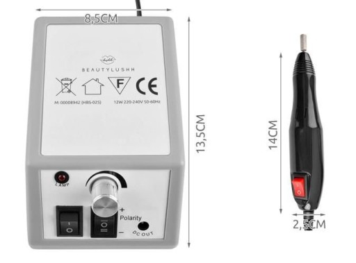 SPECYFIKACJA - kolor: szary; moc: 10W; zasilanie: 220-240V; 50-60Hz; maksymalna prędkość obrotów: 20.000/min; średnica frezu: 2,35mm – standardowa; możliwość zmiany obrotu kierunku: tak; ochrona przed przegrzaniem: tak; wymiary (dł/szer/wys): 13,5/8,5/6c; długość przewodu: 105cm; waga frezarki: 560g; waga zestawu: 0,89kg; waga z opakowaniem: 0,92kg.