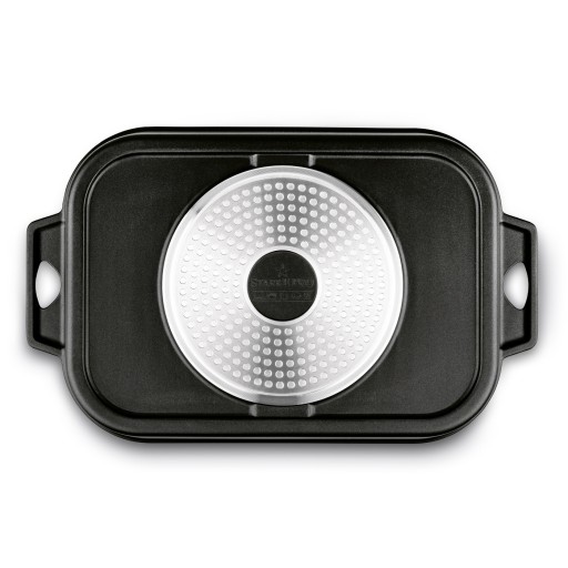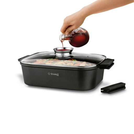 Brytfanna typu stone Starke Pro Taylor Marble 6,8 l z powłoką nieprzywierającą Greblon® C3 (warstwa podkładowa, odporna na ścieranie; warstwa zabezpieczająca; warstwa nieprzywierająca) pozwala używać mniej tłuszczu i doprawiać dania bez zdejmowania pokrywy (aromatyzer w uchwycie), dlatego przygotujesz zdrowe i pyszne pieczenie, drób czy dania wege. Prezentowana brytfanka marmurkowa, to aluminiowy i bardzo trwały odlew die cast, który szybko się nagrzewa i trudno go odkształcić, a jej pokrywa z nierdzewnym, brzegiem dobrze zamyka obieg powietrza, zwiększając temperaturę. Szybciej przyrządzisz posiłki. Oszczędzisz przy tym energię. Powłoka Greblon® C3 jest niezwykle wytrzymała (8000 cykli ścierania), więc zyskujesz naczynie na lata i bezproblemowe mycie bez długiego szorowania. Opracowała ją niemiecka firma WEILBURGER. Naczynie nadaje się na każdy rodzaj kuchenki, także na indukcję. Możesz w nim również zarumienić składniki na małej ilości tłuszczu z efektem grillowania. Ma oznaczenie PFOA Free, a jej konstrukcja jest bezpieczna dla zdrowia i nietoksyczna dla środowiska. Produkt poleca ambasador marki Starke Pro, Piotr Kucharski. W piekarniku możesz używać solidnej i masywnej brytfanny Taylor Marble stylizowanej na granitową nawet w 220 st. C – bez pokrywki oraz nakładek silikonowych na uchwyty, które są częścią kompletu. Produkt objęto 5-letnią gwarancją producenta. Odlewane uchwyty są integralną częścią korpusu naczynia. W związku z tym, że nie posiadają żadnych dodatkowych łączeń, nagrzewają się razem z brytfanną. Sprawia to, że podczas przenoszenia i zdejmowania z kuchenki oraz wyjmowania z piekarnika niezbędne jest stosowanie nakładek ochronnych (materiałowych, silikonowych) lub rękawic kuchennych, aby uniknąć oparzenia dłoni. Rolą dołączonych nakładek silikonowych jest optymalna ochrona dłoni użytkownika przed oparzeniem. W przypadku prezentowanego naczynia są one elementem koniecznym do zdjęcia brytfanny z kuchenki, przenoszenia lub wyjęcia modelu z piekarnika. Oprócz zapewnienia pewnego chwytu izolują ciepło od skóry. Naturalnym jest, że część ciepła będzie odczuwalna. Jego poziom zostanie jednak utrzymany na bezpiecznym poziomie.