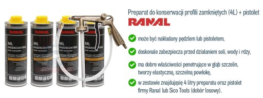 W zestawie znajdują się 4 litry preparatu do konserwacji oraz oryginalny pistolet do konserwacji marki Ranal / Sico Tools / Geko (dobór losowy).