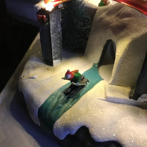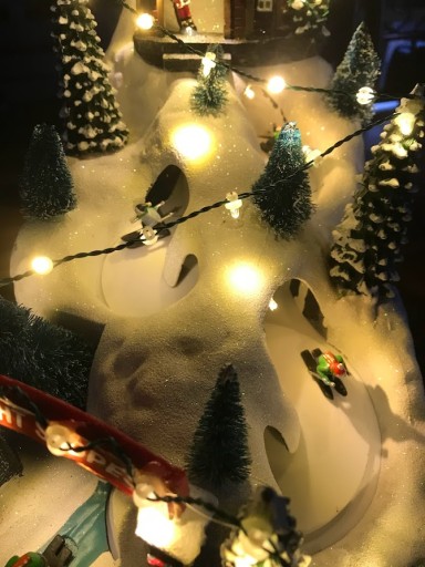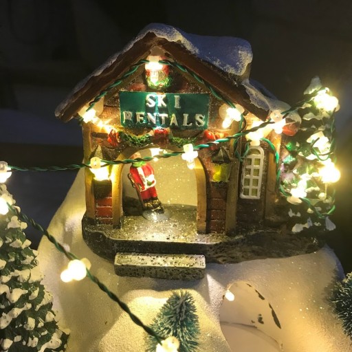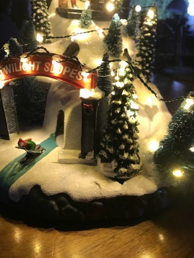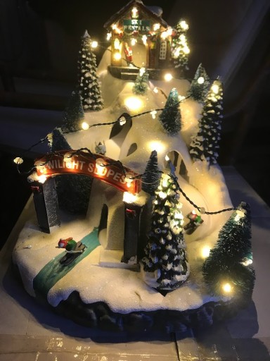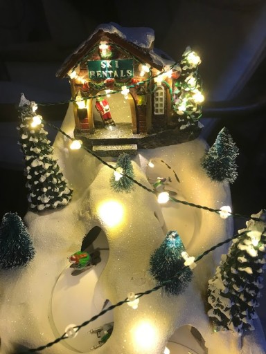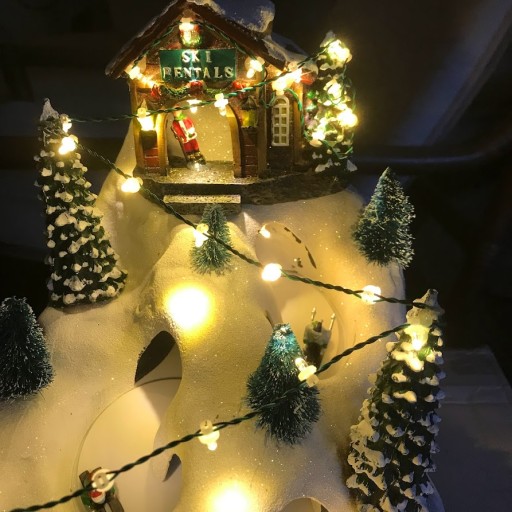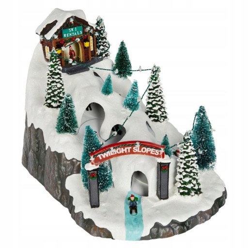 Zimowe szaleństwo w Twoim salonie! Ta wspaniała świąteczna wioska ma oświetlony stok narciarski, po którym szczęśliwe dzieci jeżdżą na nartach w rytm muzyki.