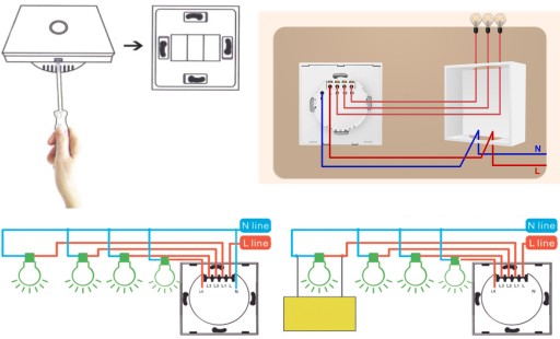 Włącznik podświetlany, sygnalizuje przy pomocy kolorów włączenie i wyłączenie światła. Sterowanie bezprzewodowe za pomocą domowej sieci WiFi lub dotykowo. Kondensator jest stosowany w celu wyeliminowania zakłóceń napięcia lampy. W przeciwnym przypadku światło może migotać.