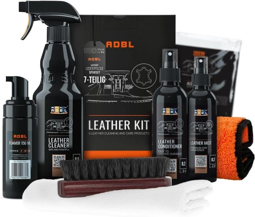 ✔️ADBL Leather Kit – to zestaw 6 produktów, które pomogą Ci zadbać o Twoją skórzaną tapicerkę. Zawiera Leather Cleaner oraz Conditioner. Jeżeli chcesz nakładać Cleaner’a jako pianę, to dołączyliśmy też pianowniczkę o pojemności 150 ml. Zestaw zawiera również Lea i Ther – mikfrofibrę oraz szczotkę, aby pomóc Ci odpowiednio nałożyć te produkty na tapicerkę. Po skończonej pracy możesz użyć dołączonego Leather Mist, aby wypełnić wnętrze swojego samochodu świetnym skórzanym zapachem!