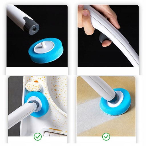 4, głębokie czyszczenie: okrągłe głowice gąbki czyszczą w trudno dostępnych miejscach pod obrzeżem miski i spuszczają, aby uzyskać głębsze i szybsze czyszczenie w celu usunięcia plam z rdzy, wapnia i wapna.
