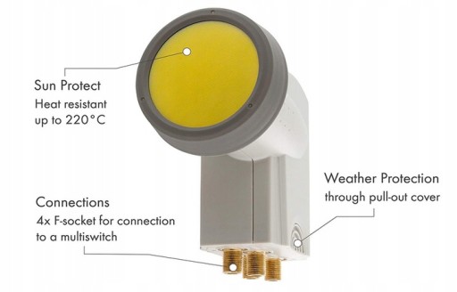 Wiosną i jesienią odbiór telewizji satelitarnej może być chwilowo zakłócony, ponieważ słońce znajduje się dokładnie za satelitą z którego odbierane są programy. Zdejmowana osłona przeciwdeszczowa chroni połączenia. W centralnym punkcie anteny satelitarnej LNB zbiera dane odbiorcze i przekazuje je do multi-przełącznika.