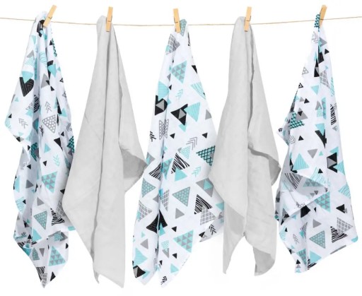 Przepiękny zestaw pięciu muślinowych pieluszek Tresor składa się z dwóch pieluszek w uniwersalnym kolorze szarym oraz trzech pieluszek w urocze figury i trójkąciki w kolorze szarym, czarnym i turkusowym na białym tle. To niezwykle modny wzór, który będzie pasował do kokonów, rożków i innych produktów z kolekcji Tresor.