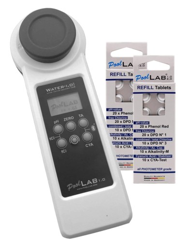 - Zakres dostawy: Fotometr PoolLab w stabilnym pudełku do przechowywania, 3 x baterie AAA, osłona przeciwsłoneczna, mieszadło, strzykawka z wodą, instrukcja obsługi (może nie być dostępna w języku polskim), 70 tabletek odczynnikowych