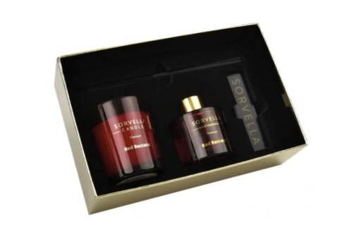 Zestaw Red Baccarat od Sorvella Perfume zawiera świecę zapachową, zapach domowy oraz zapałki, tworząc kompleksowe doświadczenie zapachowe. Są pakowane w boxy dekoracyjne.