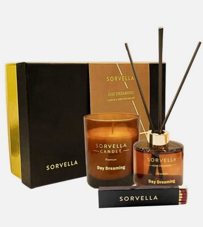 Zestaw Day Dreaming od Sorvella Perfume zawiera świecę zapachową, zapach domowy i zapałki, tworząc kompleksowe doświadczenie zapachowe. Są pakowane w boxy dekoracyjne.