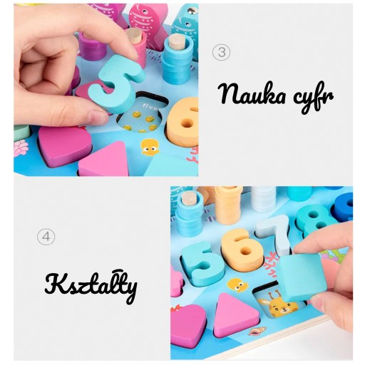 Dziecko umieszcza drewniane elementy w pasujące miejsca na drewnianej podkładce, jednocześnie ćwicząc koordynację ręka-oko i rozwijając zdolności motoryczne. Kolorowe cyferki pomogą w nauce liczenia i zapamiętywania kolejności cyfr. Figury geometryczne dostarczają dziecku świetnej zabawy i uczą rozpoznawania kształtów i kolorów. Kolorowe rybki oraz wędka posiadają magnesy.