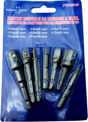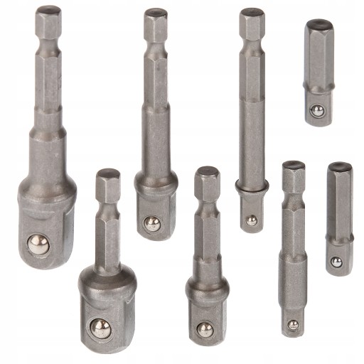 Zestaw specjalistycznych redukcji, adapterów do wkrętarki. Redukcje pozwalają na pracę wkrętarką z nasadkami. Elementy zestawu wykonane są ze stali narzędziowej, która jest bardzo wytrzymała