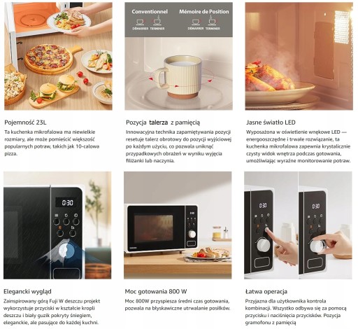 Specyfikacja produktu: wymiary zewnętrzne (szer. x gł. x wys.): 485 x 405 x 293 mm, wymiary wewnętrzne (szer. x gł. x wys.): 314 x 347 x 221 mm, średnica szklanego talerza obrotowego 270 mm. Należy pamiętać, że wymiar wewnętrzny oblicza się, mierząc maksymalną szerokość, głębokość i wysokość. Rzeczywista zdolność wchłaniania pokarmu jest mniejsza./nr WEEE: DE55703080
