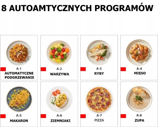 Wybierz pomiędzy automatycznym podgrzewaniem, warzywami, rybami, mięsem, makaronem, ziemniakami, pizzą, zupą. Po wybraniu potrawy i wagi kuchenka mikrofalowa ustawia odpowiednią moc i czas rozpoczęcia procesu gotowania.