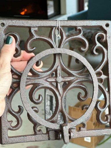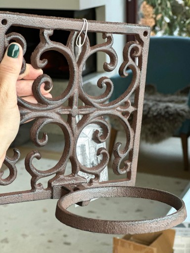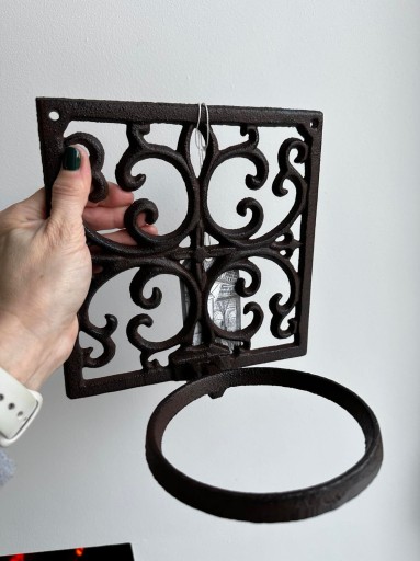 Żeliwny kwietnik z uchwytem na doniczkę.