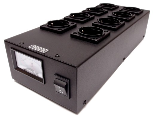 TOMANEK AUDIO POWER model TAP8ONV+ z wyłącznikiem, z 2 gniazdami wyposażonymi w DC-Blocker i woltomierzem. Listwa zasilająca 8 gniazdowa do sprzętu audio.