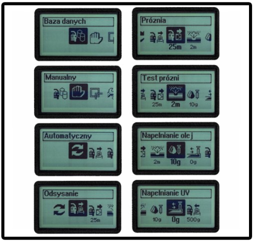 - Tryb manualny- umożliwia wprowadzenie wszystkich parametrów takich jak czas próżni, ilość oleju oraz ilość gazu ręcznie, dzięki temu trybowi każdy etap możemy wykonać osobno.