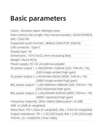 - Doskonałe Specyfikacje Techniczne: Chipset GD32F303RET6, Przetwornik Cyfrowo-Analogowy CS43198, obsługiwane formaty audio do 384kHz/32bit PCM, DSD256.