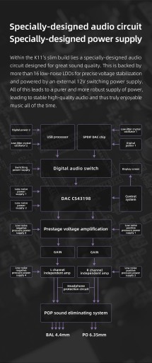 Posiadając różnorodne wejścia, takie jak USB, optyczne, koaksjalne oraz wyjścia liniowe zbalansowane 4,4 mm, 6,35 mm, RCA i koncentryczne, K11 jest gotowy sprostać wszelkim potrzebom audiofilskim. To idealny towarzysz dla długich sesji słuchania muzyki.
