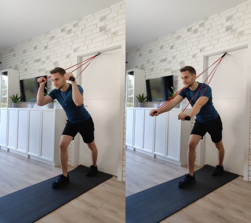 Poniżej znajdują się ćwiczenia, które polecamy wykonywać z naszymi rączkami. Są to głównie ćwiczenia, gdzie chcemy uzyskać krótszą gumę i stały opór podczas całego ruchu wykonywanego w ćwiczeniu. Polecamy wykonywać z naszymi rączkami tylko te ćwiczenia, gdzie gumy faktycznie sprawiają dyskomfort wbijając się w dłonie :)