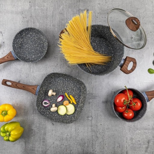 ROZMIAR : 24 CM MATERIAŁ: ALUMINIUM GRUBOŚĆ: 3MM DNO: INDUKCJA PUNKTOWA, POWŁOKA WEWNĄTRZ: NIEPRZYWIERALNA TYPU GRANIT, UCHWYT: SOFT TOUCH , IMITACJA DREWNA, PRZYSTOSOWANA DO WSZYSTKICH RODZAJÓW KUCHENEK W TYM INDUKCYJNEJ, ZALECANE MYCIE RĘCZNE