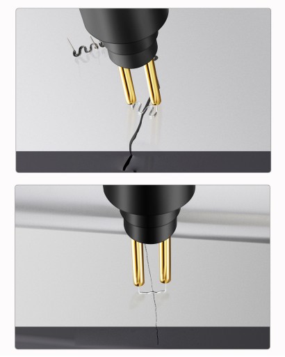 🔴 RS18 - Końcówka z niewielką falą nadaje się idealnie do spawania prostych i cienkich pęknięć. W celu połączenia obu stron pęknięcia przyłóż końcówkę prostopadle do jego linii.