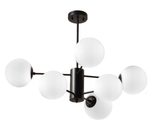 Nowoczesna czarna lampa z sześcioma szklanymi kloszami.