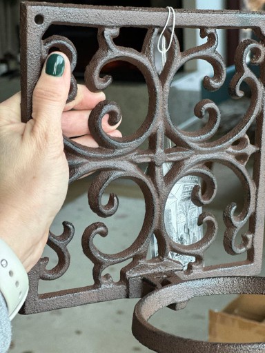 Żeliwny kwietnik z uchwytem na doniczkę.