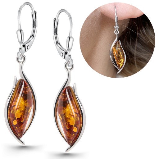 Srebrne długie kolczyki z bursztynem bałtyckim na zapięciu angielskim