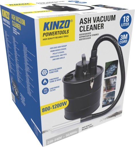 Odkurzacz do popiołu marki KINZO. Odkurzacz o mocy 1200 W ze zbiornikiem na zimny popiół o pojemności 18 l. Urządzenie posiada funkcję dmuchawy, co pozwala na utrzymanie pełnego porządku za pomocą jednego produktu. Zarówno zbiornik, jak i rura odkurzacza są ognioodporne. Odkurzacz zasilany jest sieciowo za pomocą 3-metrowego przewodu.