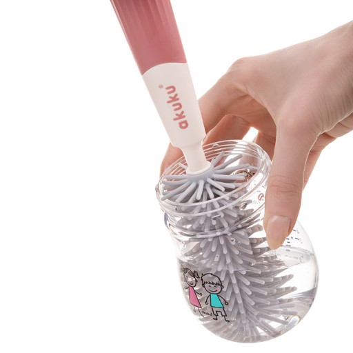 Zestaw jest wyposażony w dwie wymienne końcówki do mycia butelek, składa się ze szczotki z miękkim silikonowym włosiem, która zapewnia mycie butelek i bidonów bez zarysowań oraz zadrapań oraz wymiennej końcówki z gąbką, która jest tak wyprofilowana aby jeszcze dokładniej wyczyścić butelkę. Odpowiednio wyprofilowana końcówka dociera do trudno dostępnych miejsc, a wygodna antypoślizgowa rączka zapewnia stabilny uchwyt. Zestaw zawiera dodatkowo silikonową końcówkę do czyszczenia smoczków. Szczotka posiada otwór do zawieszenia w celu osuszenia przed kolejnym użyciem. Wykonana z trwałych i bezpiecznych materiałów, nie zawierających Bisfenolu A (% BPA).