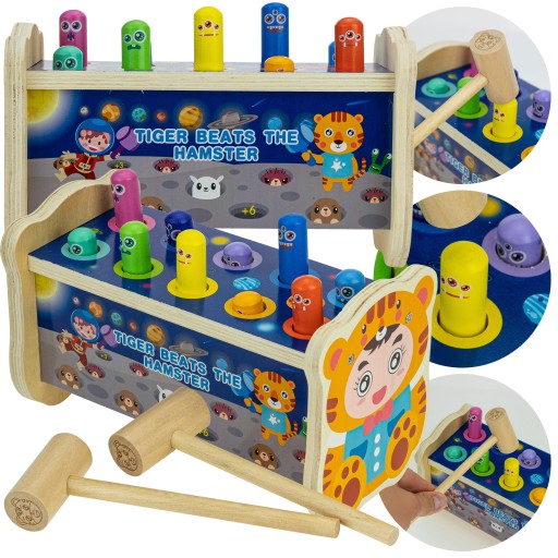 ⇒ INSTRUKCJA: Zabawa polega na uderzeniu robaczków młotkiem tak, aby chowały się do dziurek. Dzięki dwóm młotkom dwoje dzieci może bawić się w tym samym czasie.