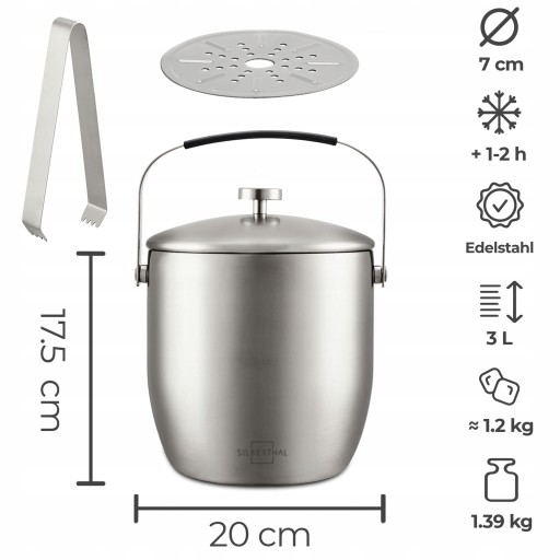 - ✔ 3 litry | 1,2 kg | 45 kostek lodu - duże, eleganckie wiaderko na lód z pokrywką i szczypcami wykonane z matowej stali nierdzewnej i dużej pojemności.