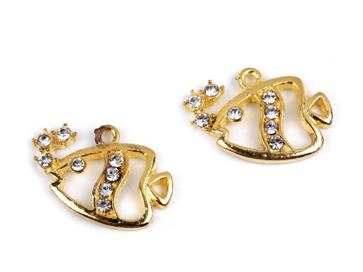 Elegancka zawieszka w kształcie ryby ozdobiona jest oszlifowanymi kamieniami. Jest jednostronna, wykonana z niemagnetycznego metalu.