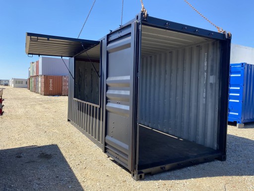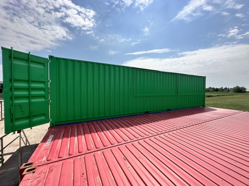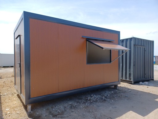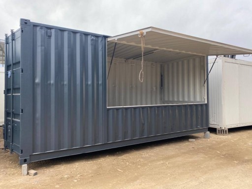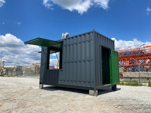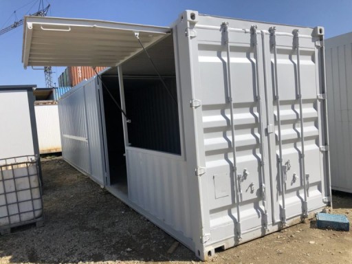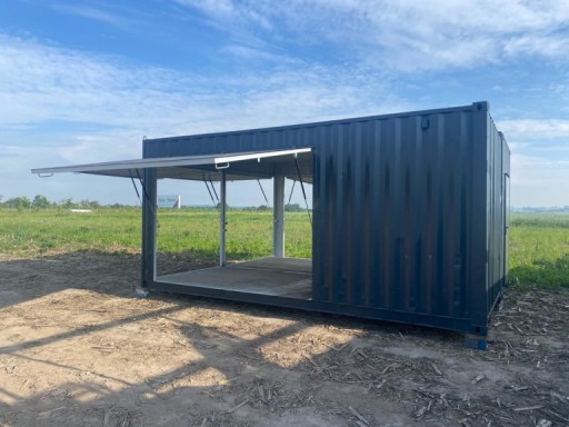 Kontener gastronomiczno-handlowy o powierzchni 15 m2 z pneumatycznie z podnoszoną klapą boczną i oryginalnymi wrotami morskimi