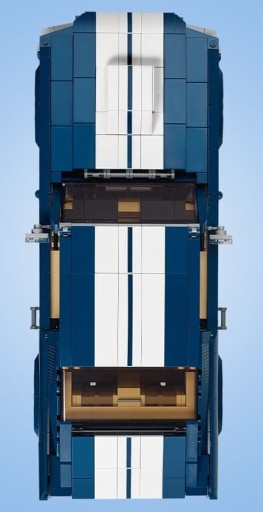 Zbuduj własnego Forda Mustanga z granatową karoserią, białymi pasami wyścigowymi, dużym wlotem powietrza, przyczepnymi oponami oraz imponującymi felgami z pięcioma szprychami. Ten nostalgiczny model przygotowany we współpracy z firmą Ford przedstawia kultowy amerykański muscle car z lat 60. XX wieku. Samochód można wyposażyć w szereg opcjonalnych elementów, takich jak turbosprężarka, tylny spojler typu ducktail, ogromne rury wydechowe, przedni spojler typu chin oraz zbiornik z podtlenkiem azotu. A jeśli chcesz, żeby Twoje auto wyglądało jeszcze bardziej zadziornie, możesz zmienić wysokość tylnej osi! Otwórz bagażnik i schowaj coś do środka, a maskę podnieś, by przyjrzeć się z bliska szczegółowemu silnikowi Big Block V8 390 z akumulatorem, przewodami i filtrem powietrza. Potem otwórz drzwi lub zdejmij panel dachowy, żeby łatwiej dostać się do szczegółowej kabiny z eleganckimi siedzeniami, radiem, skrzynią biegów na konsoli środkowej oraz działającym układem kierowania. Całości tego wspaniałego modelu LEGO® Creator Expert dopełnia nadruk logo Mustanga na maskownicy, logo GT oraz kilka tablic rejestracyjnych do wyboru.