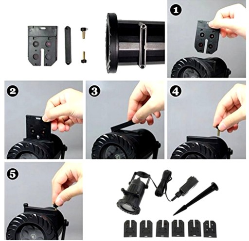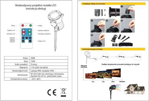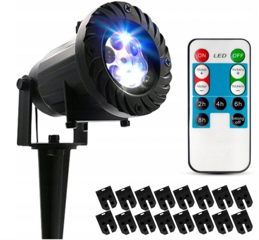 Bogaty pakiet dodatków : Nowy projektor ledowy Star shower , 16 wymiennych slajdów z obrazami o tematyce świątecznej , noworocznej i okolicznościowej , Przewód zasilający dł. kabla ok. 4,8m dedykowany zasilacz sieciowy 230V , podstawka , szpikulec , elementy montażowe , hermetyczne końcówki zasilacza