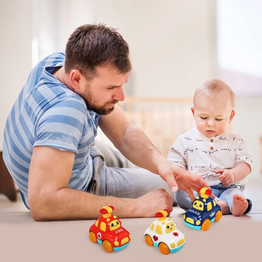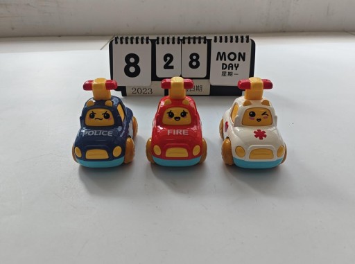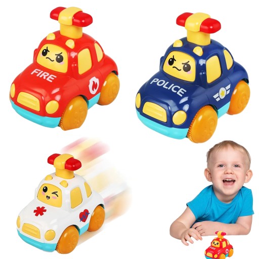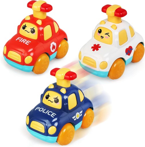 - Trzy urocze i jasne, kolorowe samochody zabawkowe z ciekawymi rysunkami, w tym radiowóz, wóz strażacki i karetka.