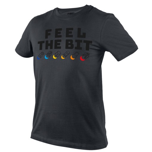 T-shirt z nadrukiem, FEEL THE BIT, rozmiar XL 81-641-XL marki NEO to t-shirt roboczy z wielobarwną, kontrastową grafiką bitów oraz napisem FEEL THE BIT. Koszulka jest w kolorze szarym. Duży nadruk na przodzie w połączeniu z hasłem jest humorystyczną zabawą słowem, ukazującą dystans noszącego ten unikatowy t-shirt. Posiada krótki rękaw oraz okrągły dekolt z elastyczną wypustką. Wyprodukowany został z miękkiej dzianiny bawełnianej (100%) o gramaturze 180 g/m2. Unikalny projekt własny marki, a także drukowane na karku logo i imienna wszywka sprawiają, że to idealny t-shirt niemal na każdą okazję – do pracy oraz do chodzenia na co dzień. Odzież marki NEO posiada certyfikat CE i polecana jest fanom motoryzacji oraz majsterkowania.