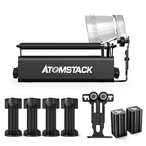 ATOMSTACK R3 PRO Laserowy wałek obrotowy Grawerowanie laserowe Wałek obrotowy w osi Y z obrotem 360° do grawerowania laserowego Puszki na ciała cylindryczne (4 x określone zakresy pomocnicze + 2 x wał pomocniczy + 1 x rama nośna)