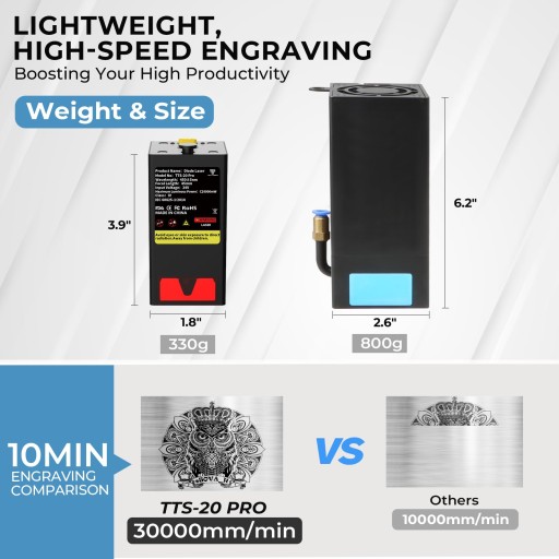 Twotree TTS-20 PRO jest wyposażony w moduł laserowy o mocy 20 W, który jest elektryczny i elektryczny, dzięki czemu nadaje się do dużej precyzji. Podwójne silniki osi Y wycinarki laserowe i grawerki emitowane przy prędkościach do 30 000 mm/min. Dzięki solidnej mocy lasera 20 W z tnie 1,18 cala sklejki, 0,79 cala czarnego akrylu, a nawet 0,002 cala stali nierdzewnej. Zwiększ swoje możliwości grawerowania dzięki maszynie do cięcia laserowego.