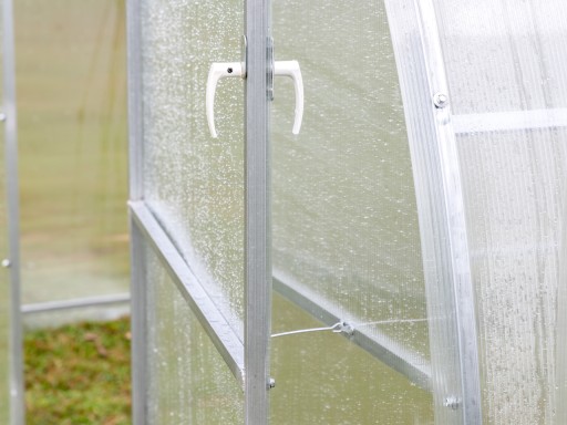 Szklarnia ma dwoje drzwi z każdej strony. W drzwiach szklarni zostały już zamontowane okna.