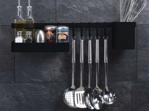 ✔️ Wieszak na przybory kuchenne z haczykami i półką.