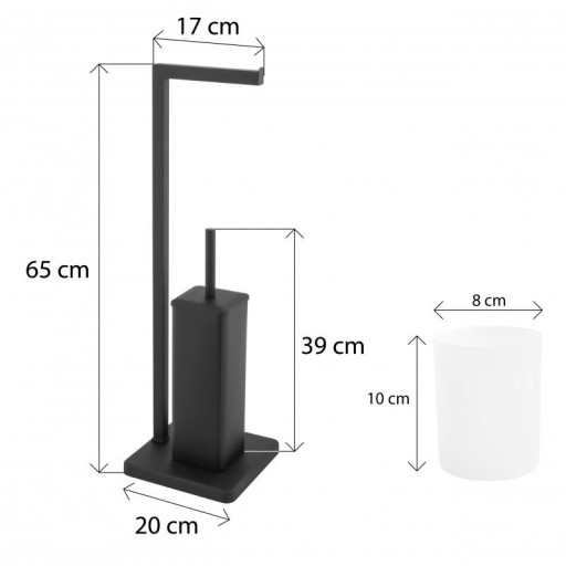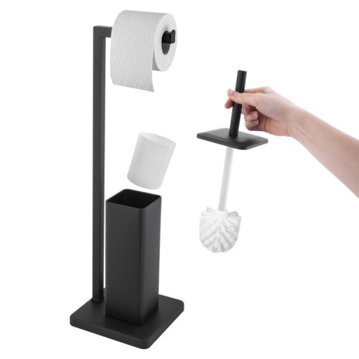 Wolnostojąca szczotka WC ze zintegrowanym uchwytem na papier toaletowy. Stojak na papier toaletowy i szczotkę wykonany jest z wysokiej jakości stali malowanej na czarno. Stojak posiada solidną podstawę o kwadratowym kształcie, zapewniającą stabilność. Szczotka posiada zabezpieczający plastikowy pojemnik chroniący rdzewieniem i ułatwiający czyszczenie. Lekki stelaż umożliwia łatwe przenoszenie stojaka w dogodne miejsce. Antypoślizgowa podstawa zapewnia stojakowi dużą stabilność.