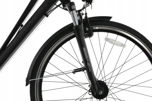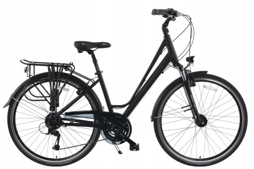 Rowery ,,Trekkingowe,, na kołach 28” , to modele ,,wszystko mające,, . Wyróżniają się pod względem praktyczności dzięki zastosowaniu dodatków takich jak błotniki, bagażniki, osłony, amortyzatory przednie, sztyce amortyzowane, solidne podpórki , regulowane mostki oraz nowoczesne lampy. Idealnie nadają się do jazdy po miejskich ścieżkach rowerowych jak i na długie wypady poza miasto. Mocne koła na solidnych, wzmacnianych, aluminiowych obręczach pozwolą pokonywać nawet najtrudniejsze szlaki wraz z ładunkiem. Odpowiednio dobrane opony zapewniają idealną przyczepność w terenie oraz na twardej nawierzchni. Dostępność w wersjach damskich i męskich w różnych rozmiarach ram pozwoli na optymalne dopasowanie oraz wspólne przejażdżki w parach lub rodzinnie . Lekkie aluminiowe komponenty, zastosowane profesjonalne trekkingowe napędy shimano oraz doskonały montaż całości sprawiają, że rower prowadzi się stabilnie a jeżeli sytuacja wymaga można zwiększyć dynamikę jazdy. Zastosowanie odpowiedniej geometrii ram, pozwala na przeniesienie części swojego ciężaru na przód roweru co umożliwia optymalne wykorzystanie siły i kondycji swojego ciała nawet na kilkuset kilometrowych wycieczkach. Kilka wersji osprzętu pozwala na dopasowanie komponentów technicznych do swoich potrzeb.