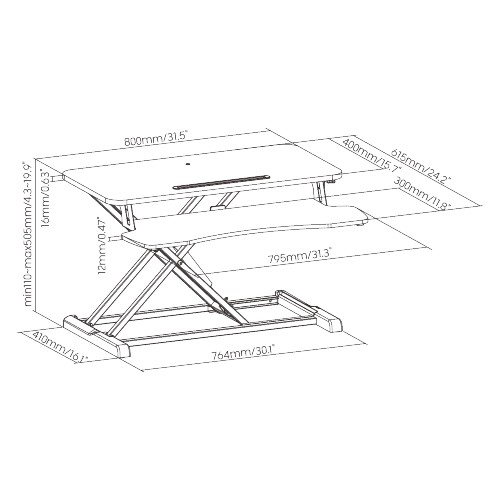 Wygodna praca to nie tylko możliwość zmiany wysokości swojego stanowiska. Ważnym czynnikiem wpływającym na jakość Twojej pracy jest również odpowiednio duża przestrzeń robocza. Regulowana podstawka na biurko została wyposażona w duży blat o wymiarach 800×400 mm. Co więcej, poniżej blatu znajduje się dodatkowa półka np. na klawiaturę o wymiarach 795×300 mm. Dzięki temu zyskasz sporo przestrzeni do wygodnej i wydajnej pracy.